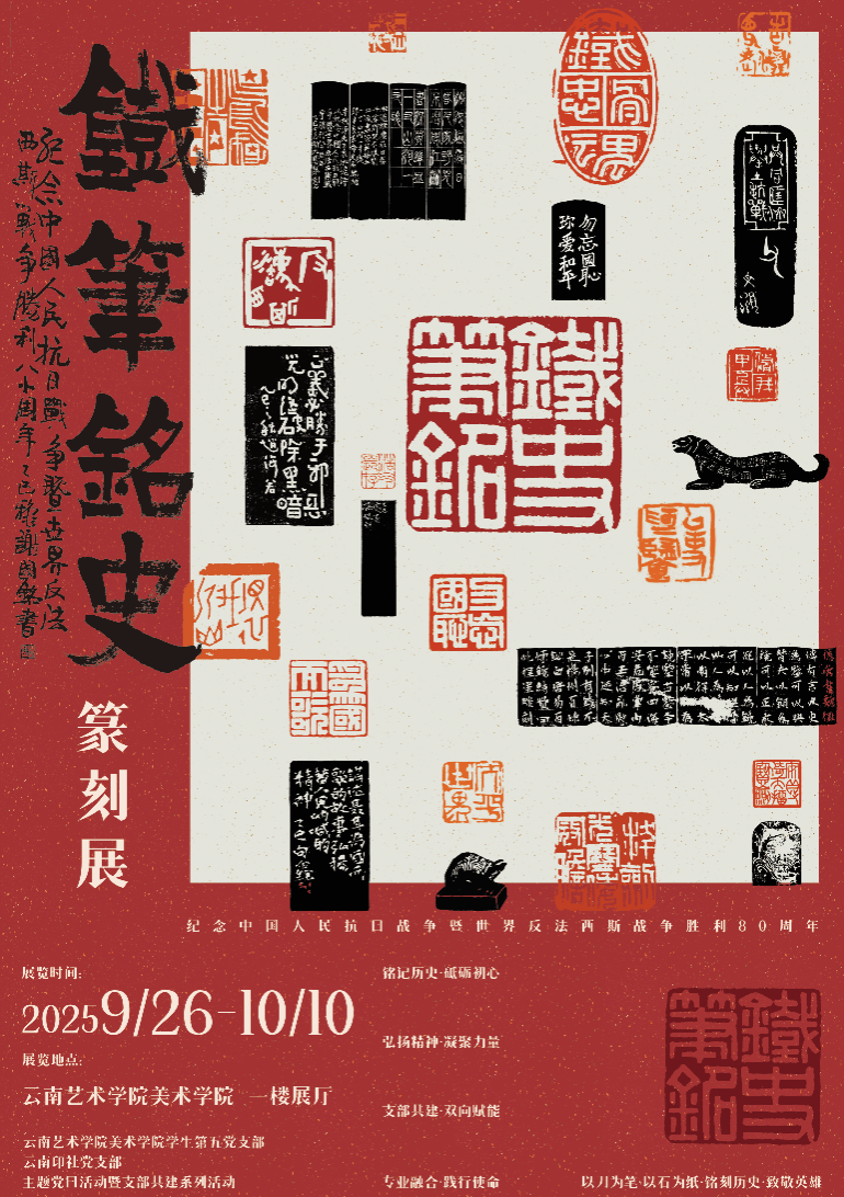 当篆刻艺术遇上红色记忆,一场别开生面的主题党日活动在william威廉英国官网拉开帷幕。2025年9月26日上午,william威廉英国官网美术学院学生第五党支部与云南印社党支部联合举办“铁笔铭史”纪念中国人民抗日战争暨世界反法西斯战争胜利八十周年篆刻展主题党日活动。两个支部党员齐聚一堂,以篆刻艺术为媒介,共同追溯抗战历史,传承红色基因。