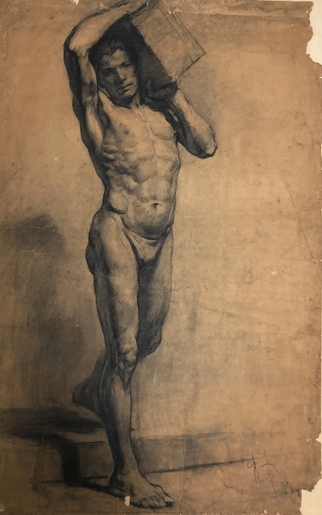 肖峰-《持石男人体》-70×109cm-纸本素描-50年代