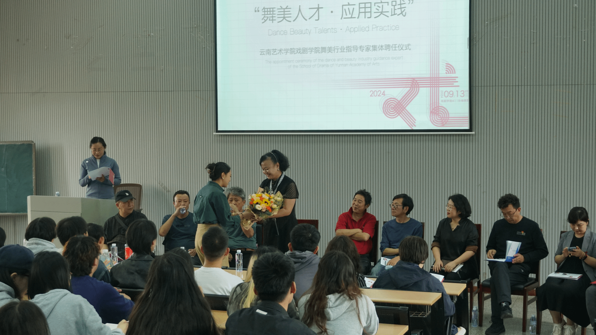 接着,在舞美专业负责人郑莹的详细介绍下,与会人员逐一了解了六位舞美行业指导专家,他们是:云南省歌舞剧院国家一级舞美设计(灯光)廖宇耕;云南省话剧院国家一级舞台设计周勇和国家一级化妆设计张力甫;云南省花灯剧院国家一级舞美设计李海宏和国家一级舞美设计(灯光)魏宇;楚雄彝族自治州民族艺术剧院国家一级舞台美术设计(服装)冷青,六位行业专家均是目前省内专业院团成就卓越、经验丰富的舞美顶尖人才。戏剧学院党委刘恩权书记和杨军院长为受聘专家们颁发聘书,专家们也依次向师生表达感言,期待与学院联合,与学生们在课堂上、实践中共同探讨,为全省全国培养实战应用型的舞美人才。