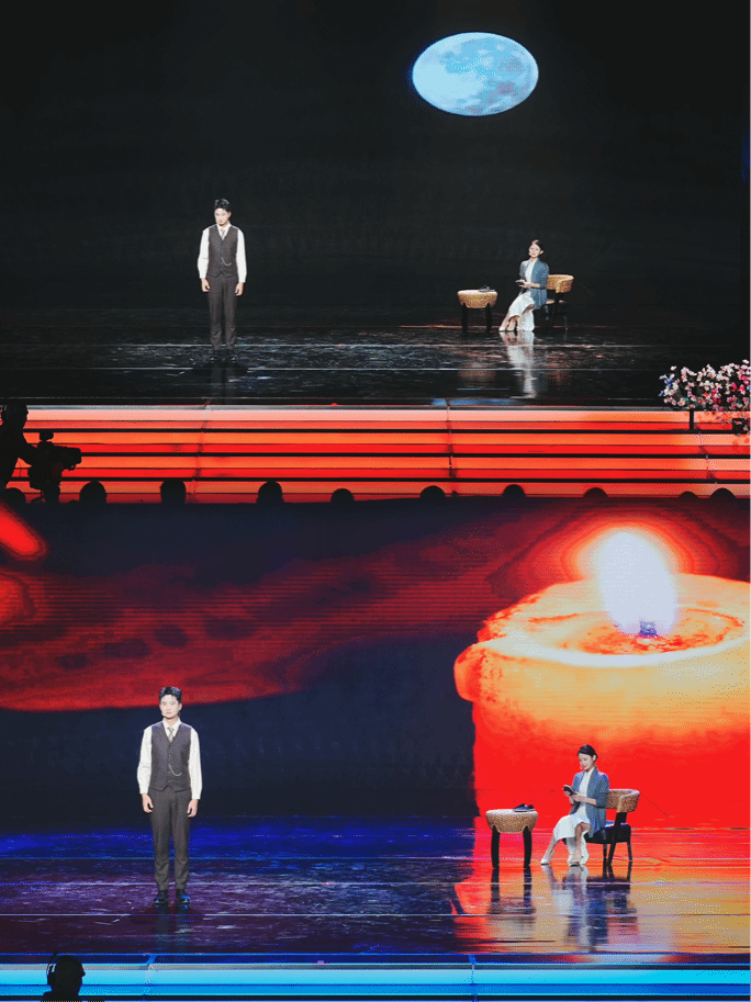 《我们的乡愁》是根据原有经典诗篇进行组合改编而成。第一段男生独颂文本选自洛夫的《血的再版》的片段,第二段女生独颂文本选自洛夫的《寄鞋》,最后合颂选自余光中的《乡愁》。乡愁是一枚小小的邮票,我在这头,大陆在那头。这一句句饱含深情的诉说,表达了海峡两岸的浓浓情谊。