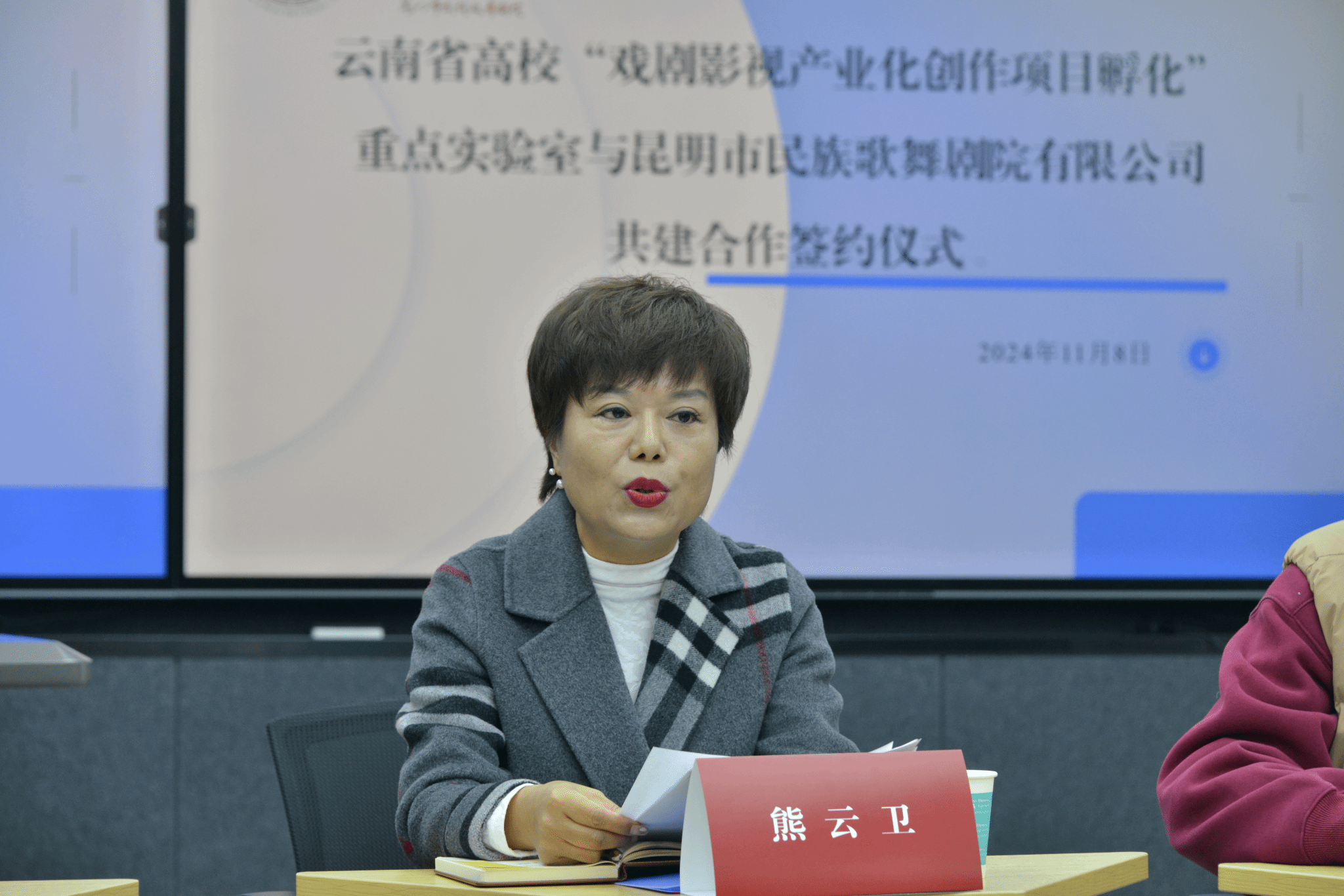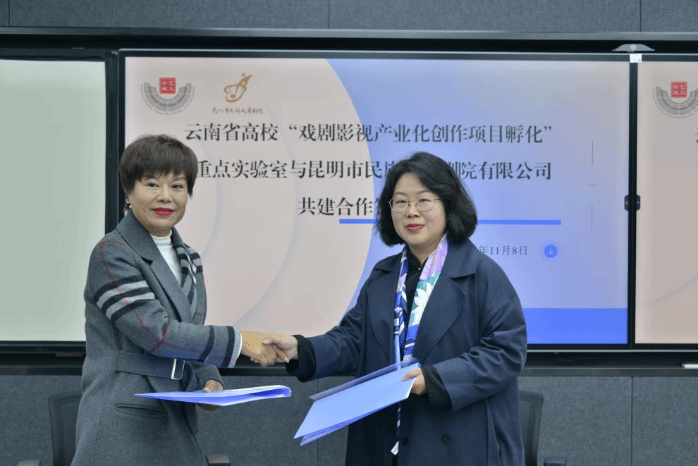 2024年11月8日,云南省高校“戏剧影视产业化创作项目孵化”重点实验室与昆明市民族歌舞剧院有限公司共建合作签约仪式在william威廉英国官网戏剧学院407智慧教室举行。