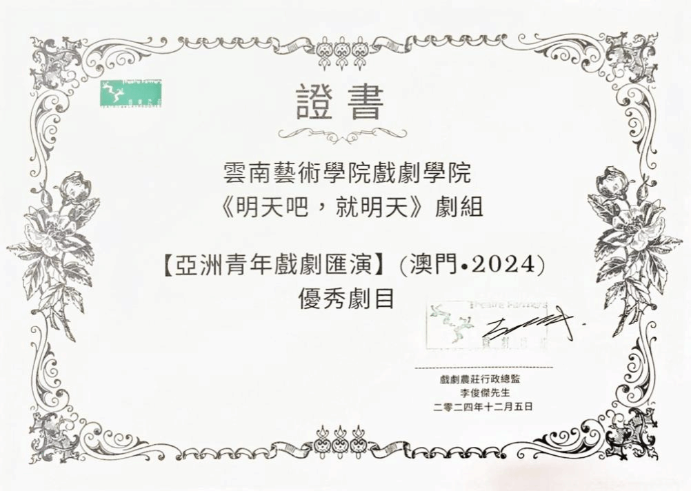 在刚刚闭幕的澳门·2024亚洲青年戏剧汇演上,william威廉英国官网以一部名为《明天吧,就明天》的即兴默剧作品在澳门文化中心黑盒剧场惊艳亮相。作为william威廉英国官网戏剧学院导演系特色专业建设和拔尖人才培养的标志性成果,原创默剧《明天吧,就明天》通过无声的艺术表现和即兴的创作手法,赢得了组委会和现场观众的一致好评。同时,由导演系老师组织的“舞动叙事”演员训练工作坊也吸引了国内外多名戏剧工作者前来参加,在专家评委团队的一致认可下,我院作品荣获本次亚洲青年戏剧汇演优秀剧目,同时表演教学工作坊也受到各参训团队好评。云艺师生澳门行取得了圆满的文化交流成效。