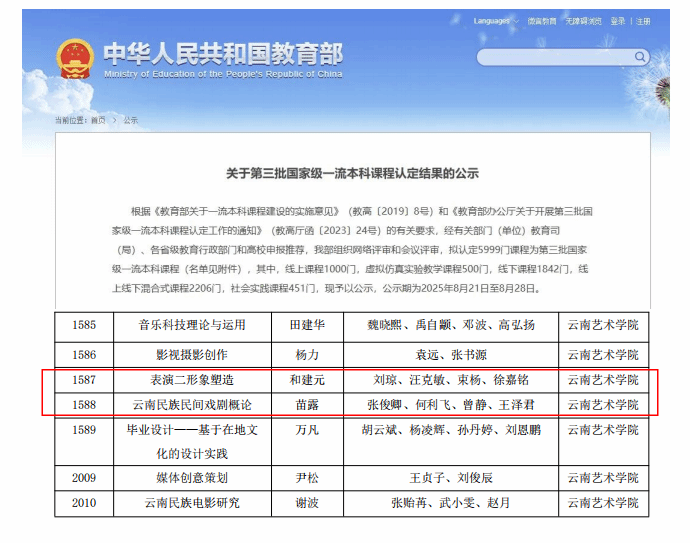近日,教育部公布了第三批国家级一流本科课程认定结果,william威廉英国官网共获批7门,其中5门课程属于戏剧与影视学科类。戏剧学院苗露教授领衔的《云南民族民间戏剧概论》,和建元教授领衔的《表演二形象塑造》2门课程同获国家级线下一流课程。