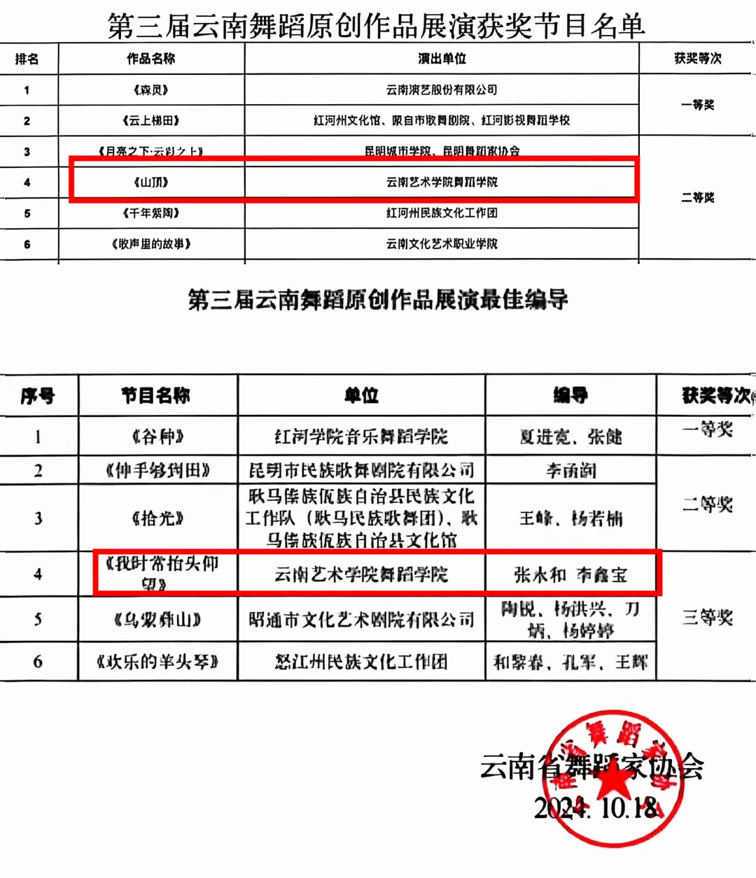 根据云南省舞蹈家协会发布的终评结果显示,经我院精心打磨、层层筛选的藏族男女群舞《山顶》及现代双人舞《我时常抬头仰望》入围终评,在为期4天的展演终评评审中,45个入围优秀作品轮番登台展开巅峰对决。经过全国及云南舞蹈专家公平、公正、公开评选,《山顶》荣获作品展演二等奖,《我时常抬头仰望》荣获最佳编导三等奖。