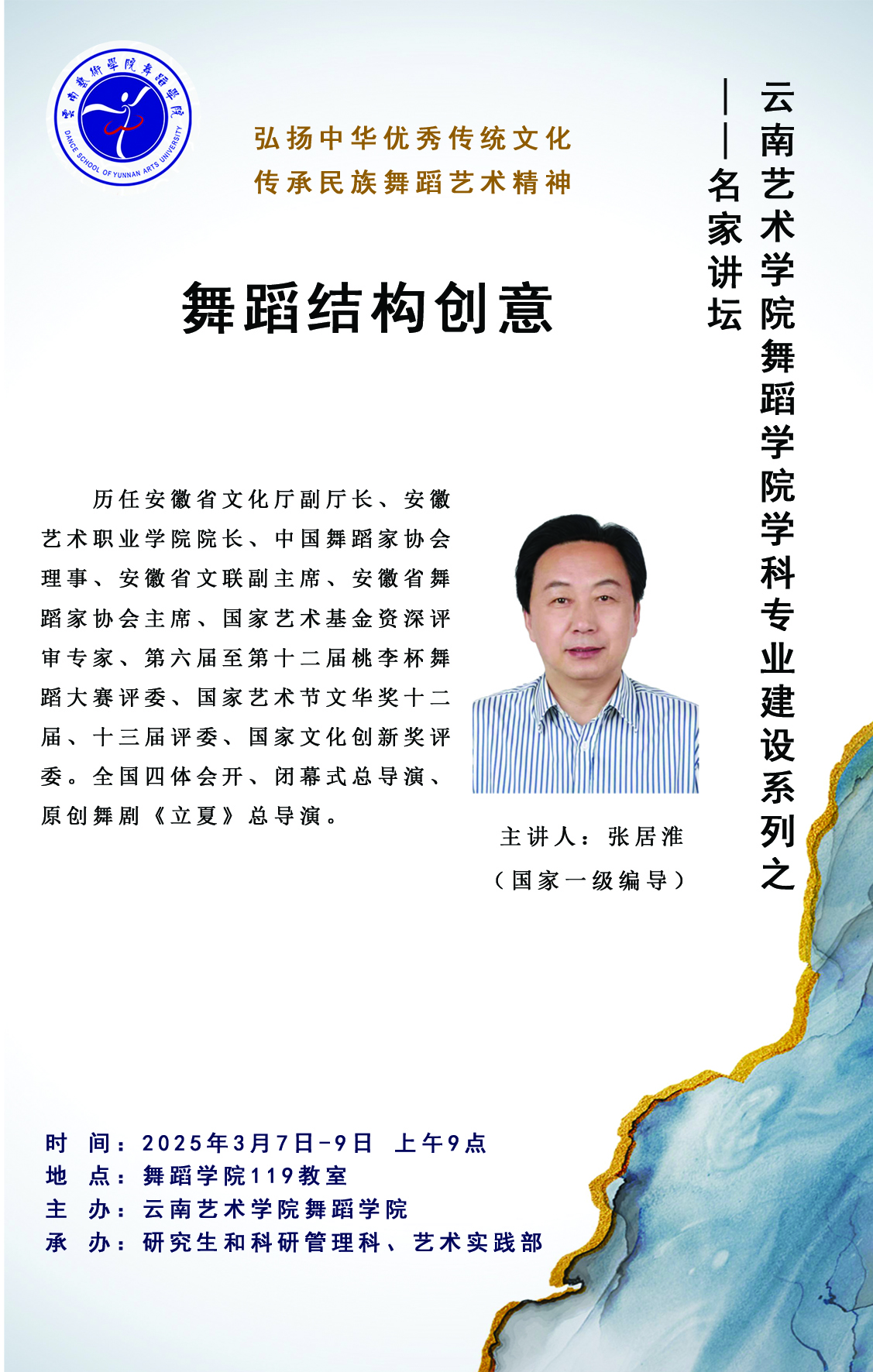 2025年3月7日—9日,舞蹈学院举办学科专业建设系列之“名家讲坛”活动。本次讲座特邀原安徽省文化厅副厅长、原安徽艺术职业学院院长、中国舞蹈家协会理事、国家艺术基金资深评审专家、国家一级编导张居淮老师主讲,面向舞蹈学院研究生开展题为《舞蹈结构创意》的学术讲座。讲座由舞蹈学院院长刘丽教授主持。