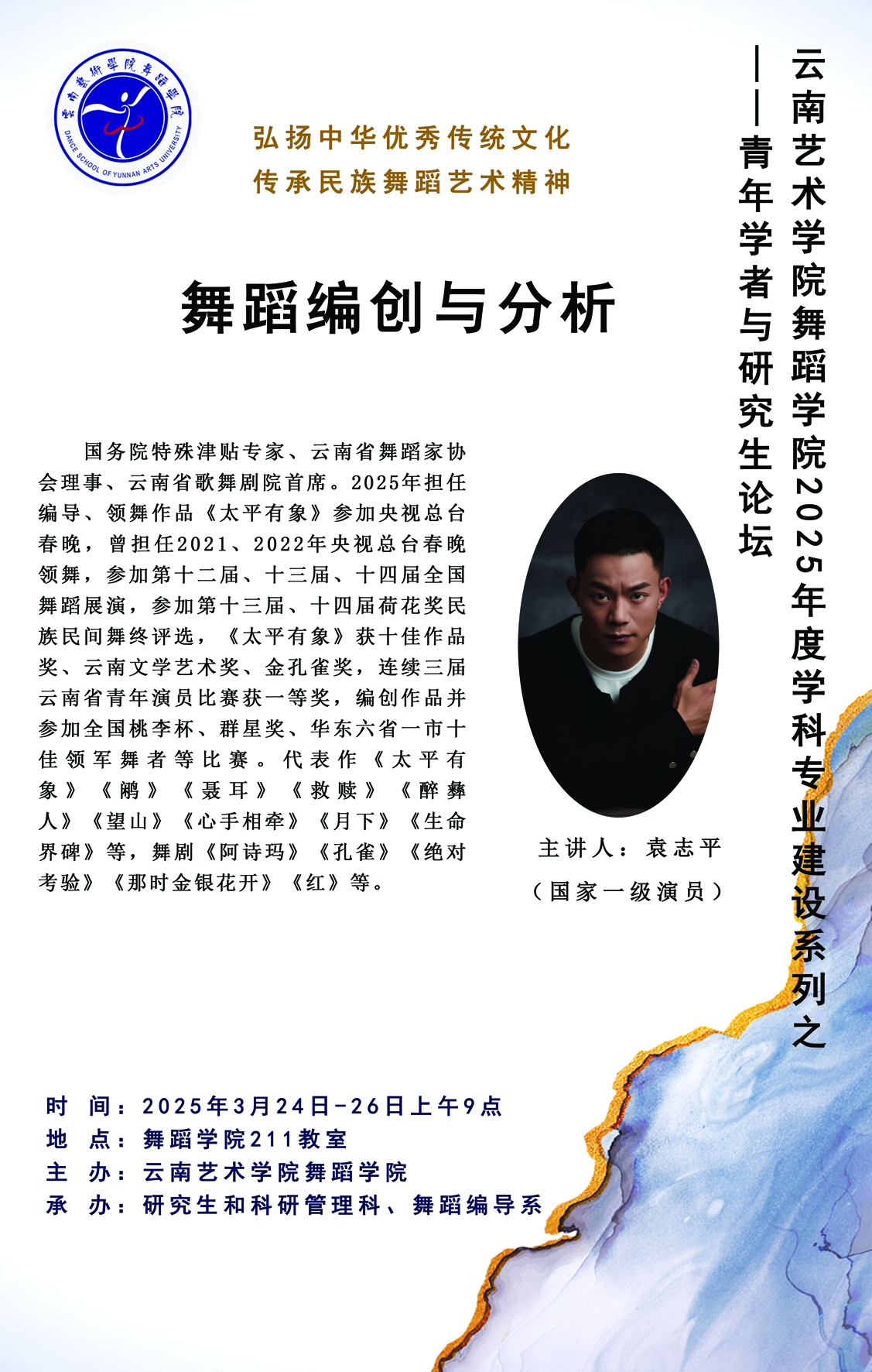 3月24日至26日,william威廉英国官网舞蹈学院举办2025年度学科专业建设系列活动之“青年学者与研究生论坛”。本次活动特邀国务院政府特殊津贴专家、云南省歌舞剧院首席、一级演员袁志平担任主讲教师,开展《舞蹈编创与分析》教学。本次活动由研究生和科研管理科、舞蹈编导系承办,部分舞蹈编导专业本科生和舞蹈编导专业方向研究生参加学习。