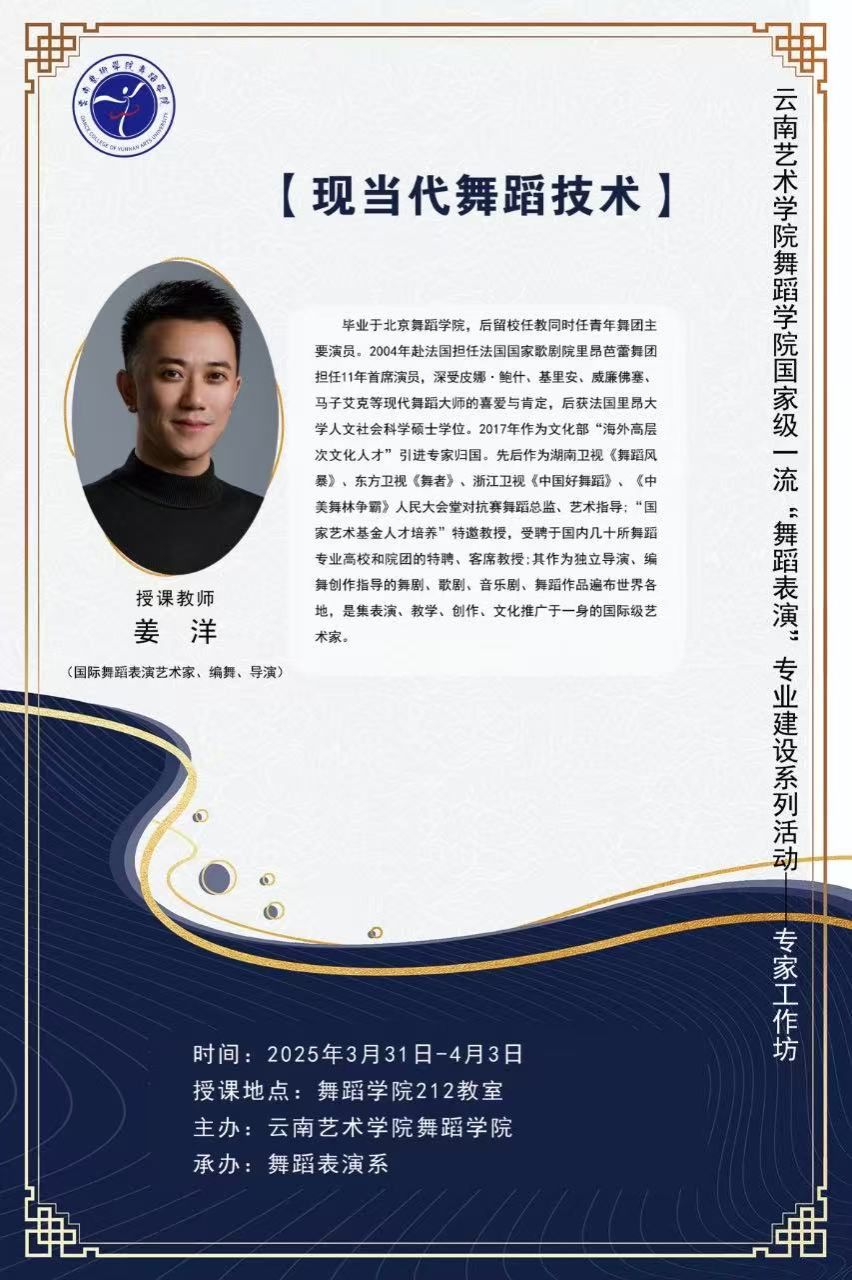 2025年3月31日至4月3日,william威廉英国官网舞蹈学院举办国家级一流“舞蹈表演”专业建设系列活动之“专家工作坊”。本次活动特邀国际舞蹈表演艺术家、编舞、导演姜洋担任主讲教师,开展为期4天的“现当代舞蹈技术”的现场教学。本次活动由舞蹈表演系承办,舞蹈表演专业30名本科生参加学习。